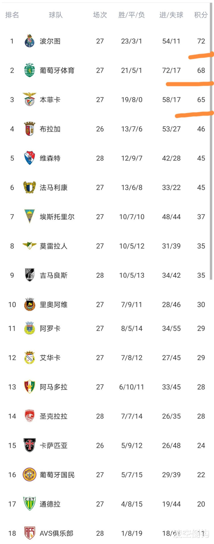 至此葡超积分榜发生变化,我们来看看。可以看到穆帅执教的本菲卡积65分落后榜首7分,葡萄牙体育落后榜首4分。