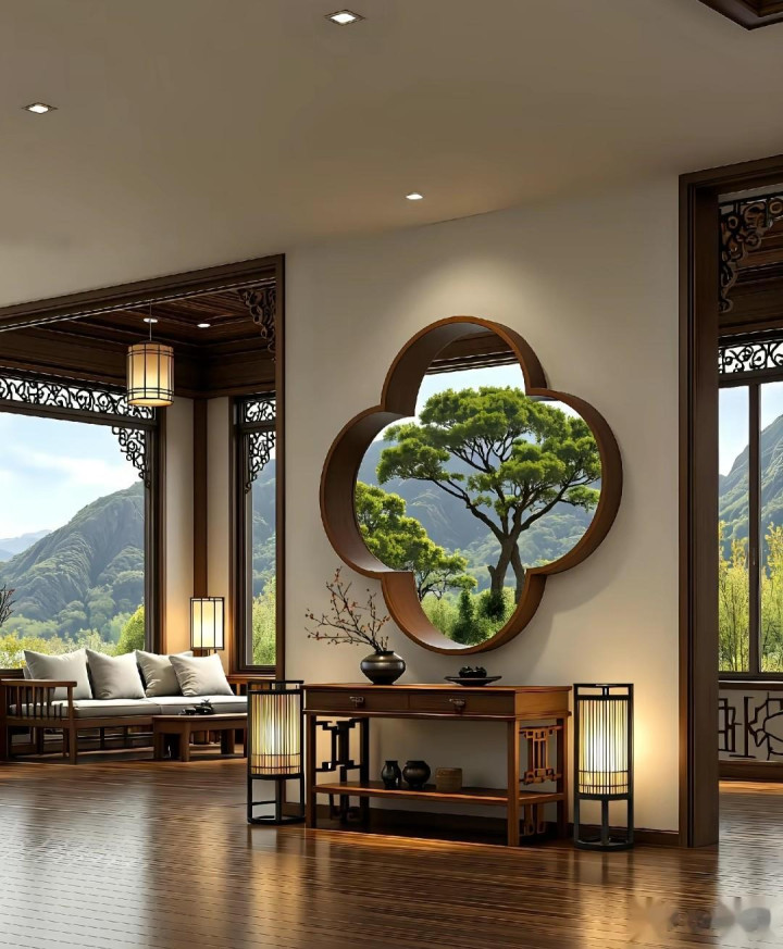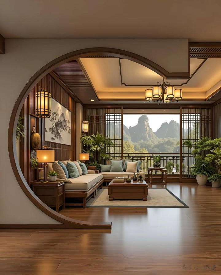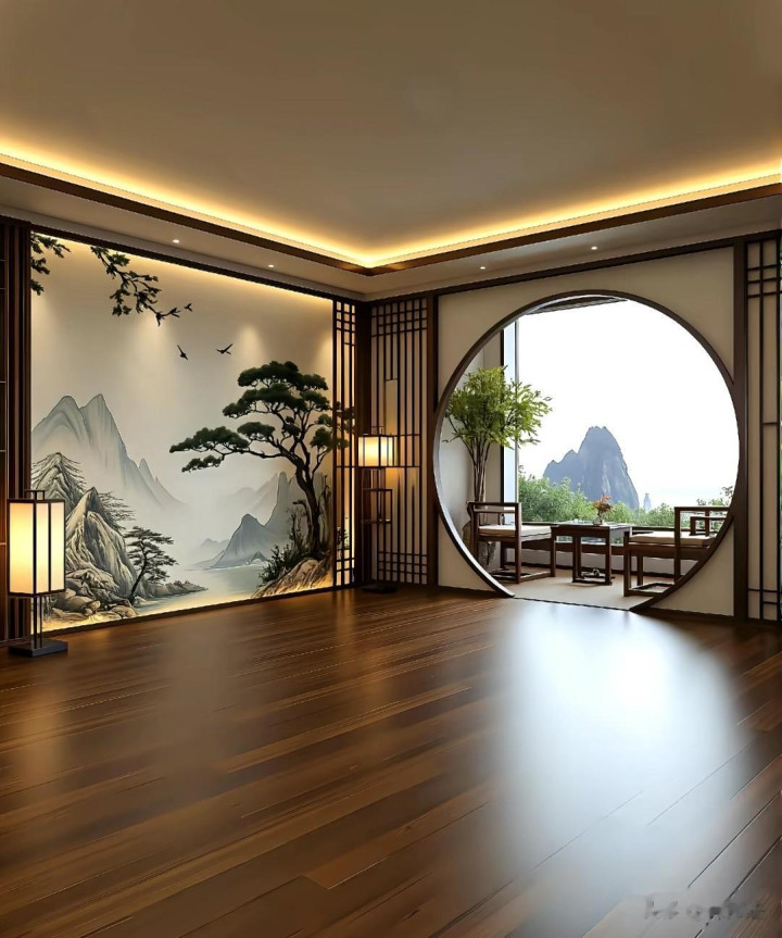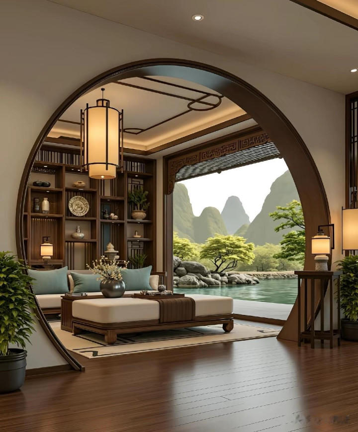 它摒弃浮华装饰,以线条的流动、材质的温润、光影的层次,营造出“疏朗有致、静谧深远”的东方意境。月洞门框景如画,将窗外青山与室内茶席融为一体。